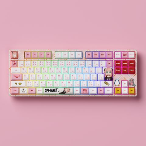 アーニャをモチーフにした、ピンク基調のデザインです。キーキャップには、アーニャの生活に欠かせない宝物を散りばめました。付属のスペースキーにはアーニャとボンドの可愛い寝顔を使用し、日常のキー入力で癒しを感じられます。