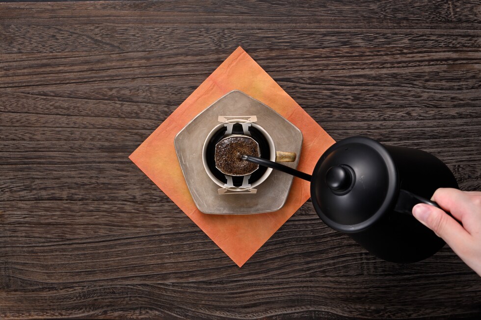 (3)少量のお湯を注ぎ、約20秒蒸らした後、2~3回に分けてお湯を注いでください。(できあがり約130~140ml)