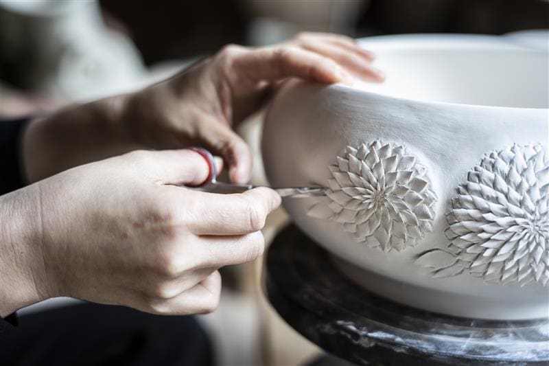 鋏で磁器を切る新しい装飾の面白さに没頭し、技術を上げ精度を追求しでいけばいくほど、自身もこの装飾の美しさの虜となりました。