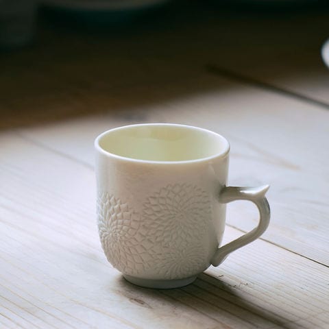 紅村窯マグカップは、京都の窯元、紅村窯 四代目 林侑子氏が独自に編み出した「土鋏(つちばさみ)という技法により制作しています。和菓子の伝統技法「はさみ菊」に着想を得て、磁器から花びらを一枚ずつ丁寧に切り出し、立体的な花の装飾を施した手仕事ならではの美しさが際立つ作品です。今回のためにオリジナルで作り上げるマグカップはピンクとイエローの2色のカラーをそれぞれご用意しました。