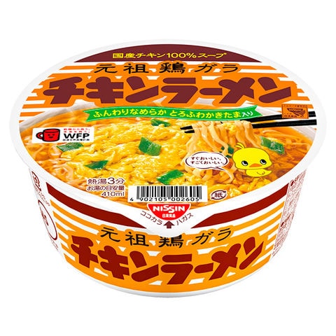 油揚げめん(小麦粉、植物油脂、しょうゆ、食塩、チキンエキス、糖類、香辛料、たん白加水分解物、卵粉、デキストリン、香味調味料、オニオンパウダー)、かやく(卵、ねぎ)/加工でん粉、調味料(アミノ酸等)、炭酸Ca、かんすい、酸化防止剤(ビタミンE)、増粘剤(キサンタンガム)、カロチノイド色素、ビタミンB2、ビタミンB1、(一部に小麦・卵・乳成分・ごま・大豆・鶏肉を含む)