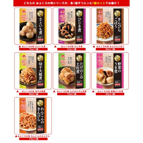 【おふくろの味 さといも煮】75g×1個、【おふくろの味 ひじき煮】70g×1個、【おふくろの味 きんぴらごぼう】60g×1個、【おふくろの味 切干大根煮】80g×1個、【おふくろの味 たけのこの土佐煮】75g×1個、【おふくろの味 野菜のうま煮】60g×1個、【おふくろの味 れんこんのきんぴら】75g×1個