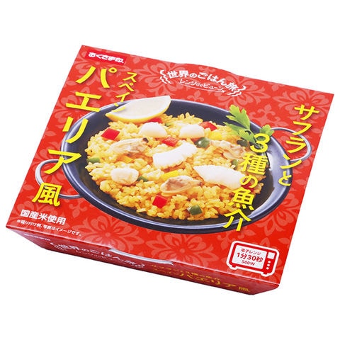 精米(国産)、いか、いたや貝、ピーマン、あさり、チキンブイヨン、パエリア用調味料、チキンエキス、ホタテエキスパウダー、バター、ガーリックパウダー、酵母エキス、香辛料、還元水飴/加工でん粉、調味料(アミノ酸等)、着色料(クチナシ)、酸化防止剤(抽出V.E)、酸味料、香料、香辛料抽出物、pH調整剤、トレハロース、(一部に乳成分・小麦・えび・いか・大豆・鶏肉を含む)