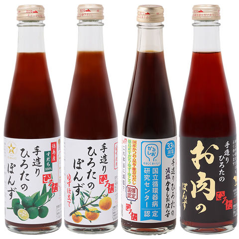 手造りひろたのぽんず3本、手造りひろたのぽんずゆず仕立て3本、手造りひろたの減塩かるしおぽんず3本、手造りひろたのお肉のぽんず3本