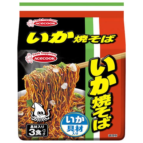 エースコック いか焼そば 具材入り 3食パック×9袋入| 送料無料 具材入り 袋麺 インスタント麺 即席 やきそば 焼きそば