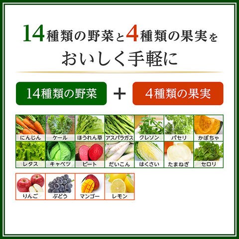 野菜(にんじん(輸入)、ケール、ほうれん草、アスパラガス、クレソン、パセリ、かぼちゃ、レタス、キャベツ、ビート、だいこん、はくさい、たまねぎ、セロリ)、果実(りんご、ぶどう(岡山県産ピオーネ100%)、マンゴー、レモン)/クエン酸、香料