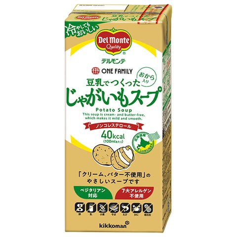豆乳(大豆(カナダ又はアメリカ))(分別生産流通管理済み))、じゃがいもペースト、砂糖、炒めたまねぎ、植物油脂、粉末おから、食塩、香味食用油、白ワイン、酵母エキス、香辛料/増粘剤(加工でん粉)、pH調整剤、乳化剤、香料