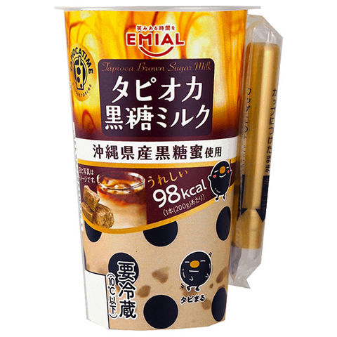 ブラックタピオカ(国内製造(でん粉、コラーゲンペプチド))、糖類(砂糖、果糖ぶどう糖液糖)、乳製品、乳等を主要原料とする食品、黒糖蜜、紅茶/糊料(加工デンプン、増粘多糖類)、香料、乳化剤、トレハロース、イカスミ色素、水酸化Ca、pH調整剤、(一部に乳成分・いか・大豆・ゼラチンを含む)