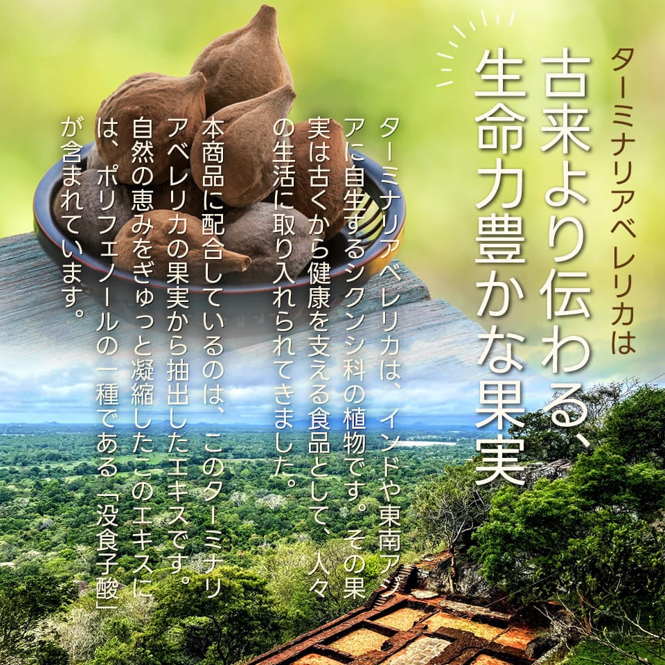 ターミナリアベレリカエキス末(ターミナリアベレリカエキス、デキストリン)(インド産)/結晶セルロース、ステアリン酸カルシウム、二酸化ケイ素