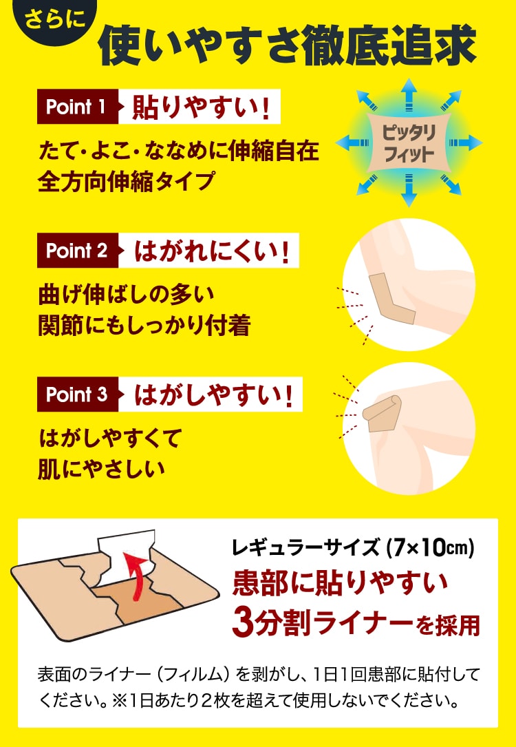 表面のフィルムをはがし、1 日1 回患部に貼付してください。