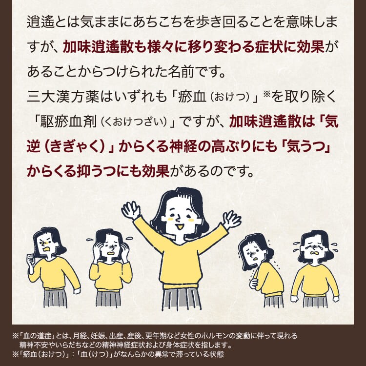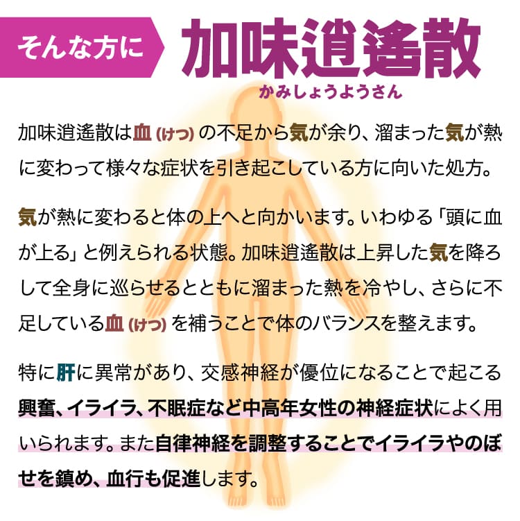 (トウキ:1.5g、シャクヤク:1.5g、ビャクジュツ:1.5g、ブクリョウ:1.5g、サイコ:1.5g、ボタンピ:1g、サンシシ:1g、カンゾウ:1g、ショウキョウ:0.5g、ハッカ:0.5g)