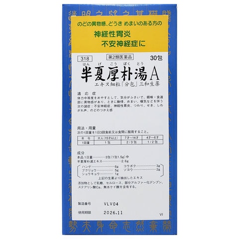 効能・効果 体力中等度をめやすとして,気分がふさいで,咽喉・食道部に異物感があり,ときに動悸,めまい,嘔気などを伴う次の諸症:不安神経症,神経性胃炎,つわり,せき,しわがれ声,のどのつかえ感