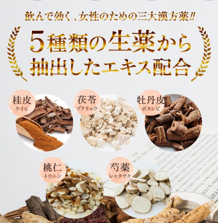 2包〔大人1日服用量〕中、次の成分を含有する。桂枝茯苓丸エキス:2/3量(ケイヒ 2.67g、ブクリョウ 2.67g、ボタンピ 2.67g、トウニン 2.67g、シャクヤク 2.67g より抽出)、2包(5.0g)中1.67g