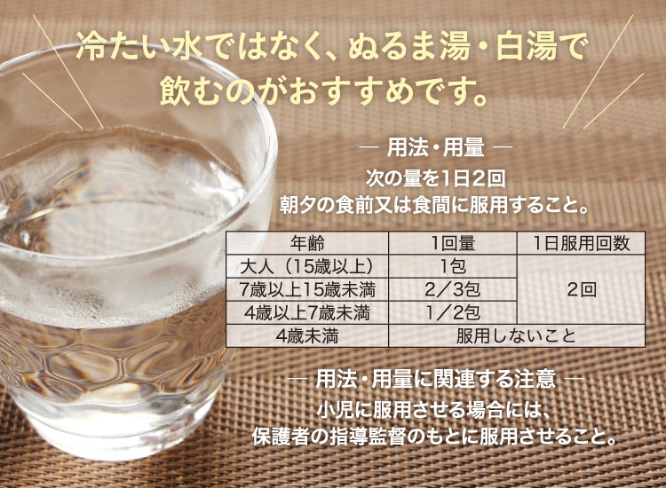 次の量を1日2回朝夕の食前又は食間に服用してください。