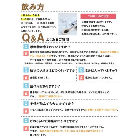 | 梅肉エキス(紀州産梅)、かんしょ(アヤムラサキ:芋)、でん粉、食物繊維、カキ殻末 | ||