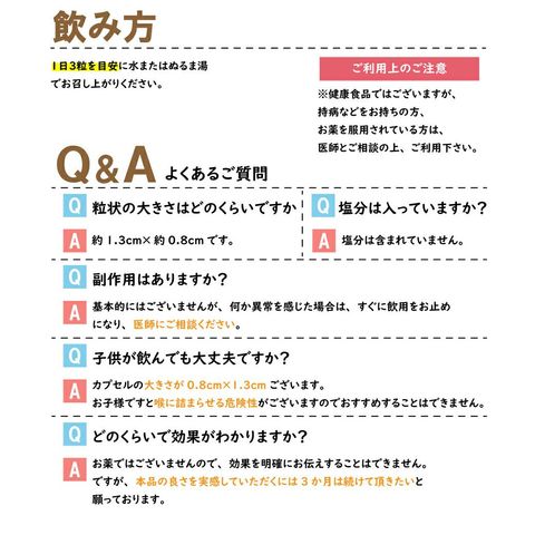 | 内容量 | (約45粒) 21.15g(15日分) (約90粒) 42.3g(30日分) (約180粒) 84.6g(60日分) |