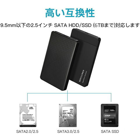 【2.5インチ HDD/SSDケース】USB3.0とUASP協議をサポートし、すべての7 mm / 9 mmの厚さの2.5インチSATAインターフェース機械ハードディスク/固体ハードディスク(最大6 TBのハードディスクをサポートする)をサポートしている。USB3.0インタフェースで、USB2.0より10倍速いの5Gbps転送速度に達すことができ。ホストとデバイスの双方がUASPに対応していれば、普通のUSB3.0と比べて20%の転送スピードをアップします。【高い互換性のSSDケース】本ドライブケースは全ての9.5mm/7mm厚の標準2.5インチSATA HDD/SSDに対応。Windows XP/Vista/7/8/10、Mac OS 9.1/10.8.4 、Linux及びそれ以降のバージョンにサポートするハードディスクケースです