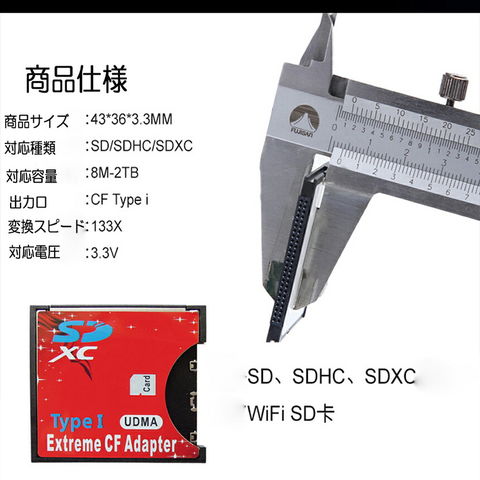 SDカードからCFカードType Iへの変換アダプタです。(カメラとの相性があるようです)互換性:WiFiSD/SDXC/SDHC(64G対応)/SD/MMC カード対応