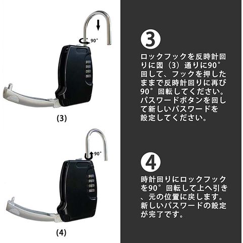 二番:フックを反時計周りに90度回し、下に押し込みながら、さらに反時計周りに90度回す