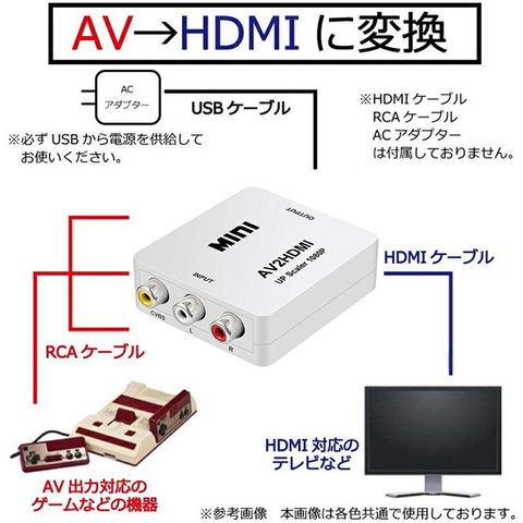 ※AV2HDMIコンバーターは、アナログコンポジットHDMI を(RCA3/CVBS)に変換します。逆方向(HDMI to AV )にはご使用できません。