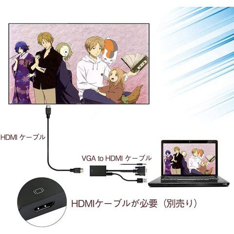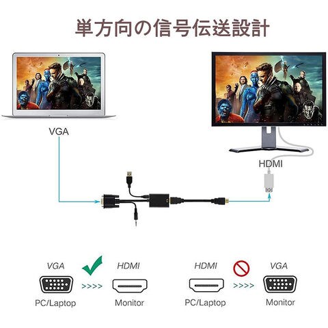 VGAからHDMIに変換: HDMI端子の無いPC等のVGA出力をHDMIに変換し、大画面テレビ・モニターに映像を出力できます。