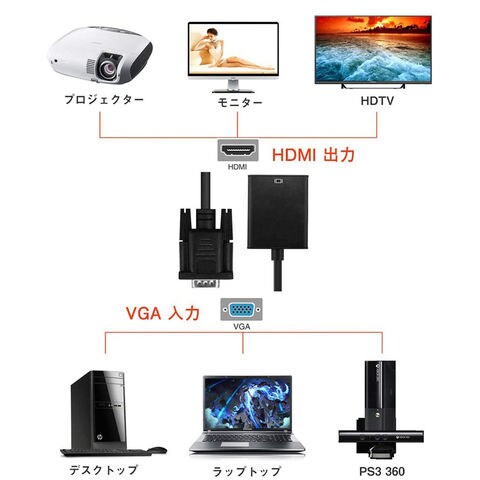 対応機器: HDMI対応のパソコンやゲーム機、HDDレコーダなどの機器を、VGA端子対応のテレビやディスプレイに接続して使用することもできます。