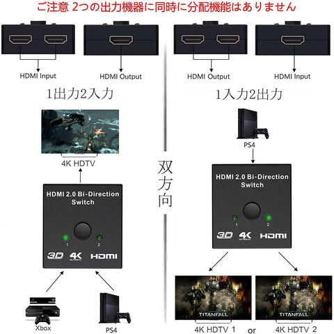 HDMI切替器 4Kx2k HDCP 3D対応 高画質 セレクター Ver2.0 双方向 1入力2出力 2入力1出力 手動 電源不要 PS3 PS4 PS4pro NintendSwitch Xbox 送料無料