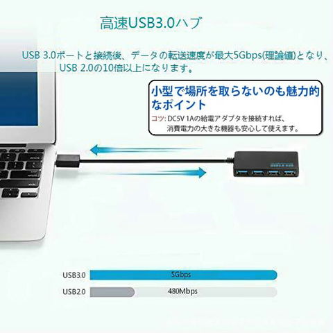 USB3.0 ハブ 4ポート バスパワー 5Gbps 高速転送 ウルトラスリム 高速データ転送 USB3.0高速ハブ 給電ポート付き コンパクト USB HUB LED指示灯 Windows Mac Linux等対応