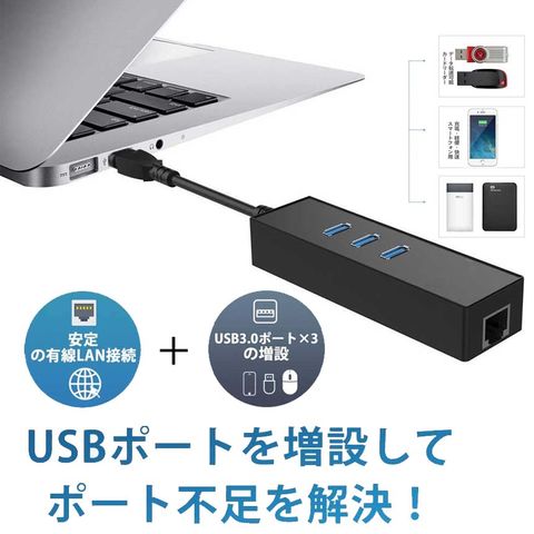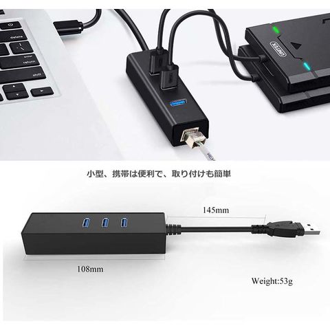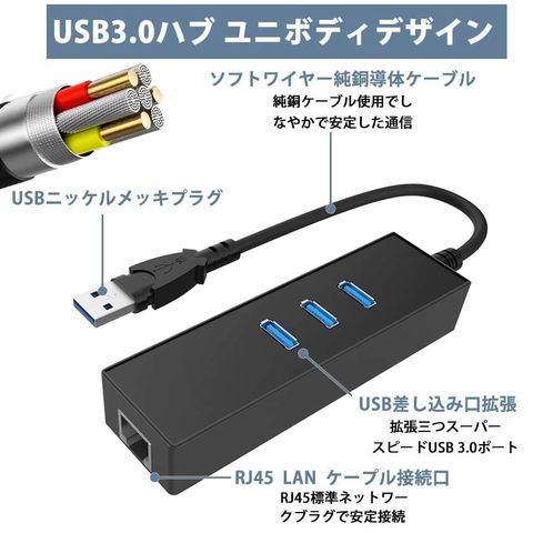 【3-in-1多機能USB3.0ハブ】本製品はコンピュータのUSBポートで、4ポートに1000M Ethernet LANポートX1、USB 3.0ポートX3のを搭載しています。拡張三つスーパースピードUSB 3.0ポートをお使いのデバイスにつなぐことで最大5Gbpsのデータ転送速度を実現して、HD動画も数秒で転送可能です。【挿すだけの操作で使用簡単】ドライバCD不要で、給電不要で軽量&ポータブルの設計を採用され、挿すだけの操作で簡単に使用できます。WIFI環境持たないところやUSB周辺機器接続ための拡張に役立ちます。MacBook AirのUSBに繋いでEthernetネットワークに簡単に接続できます。カバに入れるサイズで、コンパクトなサイズに持ち運びに便利です。
