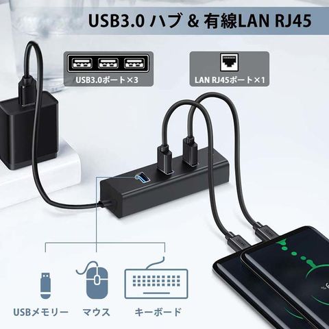 【安定性を強化するUSB ハブ】10/100/1000など高速LAN接続対応、Ethernet LANポートが通信速度1000Mbpsまで対応可能、安定性抜群です!マウスやハードディスク、フラッシュメモリなどのUSB機器を接続してご利用いただけます。会議、オフィス、家庭などの場所に適しています。