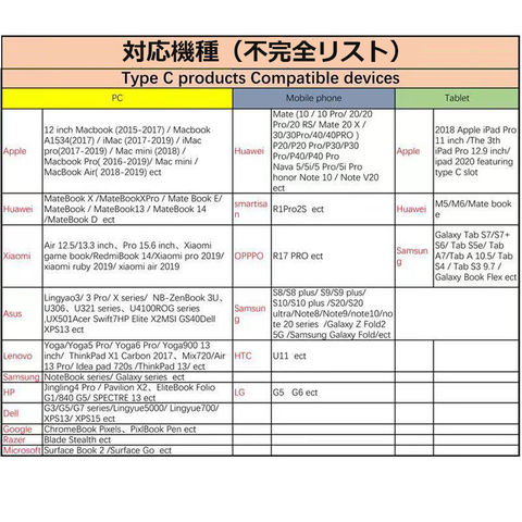 幅広い互換性:最新のMacBook Pro 2016/2017、MacBook 2015/2016、Chromebook Pixel、Lenovo Yoga 900、Yoga3Pro、Dell XPS 13(9350)Dell XPS 15 9550、HP Spectre X2、HP x360 Samsung Galaxy Note 8 /S8 / S8 Plus、HTC U11などと互換性があります。