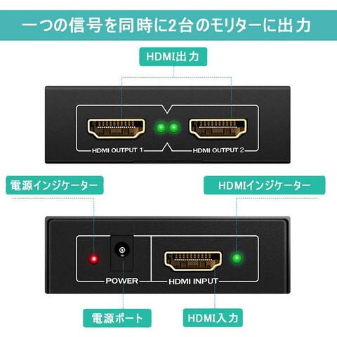 【1入力2出力】HDMI分配器は1台のHDMI機器からテレビやプロジェクターなど2台のモニタに2画面同時出力することができます。品質損失なしで映像・音声を完璧に伝送できます。【高解像度&高速伝送】HDMIスプリッターは3D/1080Pまでの解像度とHDオーディオをサポートできます。伝送も早くて音声と画質などが綺麗で歪めません。臨場感溢れる高精細な大画面映像を楽しみます。