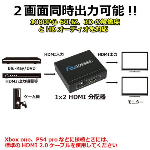 【2個セット】HDMI 分配器 1入力2出力 同時出力 1080P 3D HDMIスプリーター HDTV PS4 スイッチ switch Blu-ray DVD HDカムコーダー HTPC等に対応