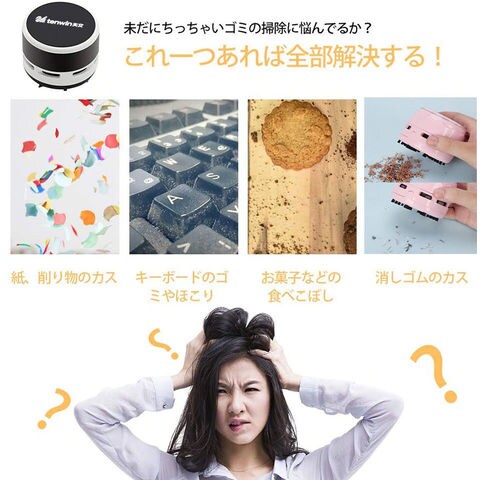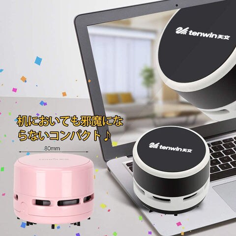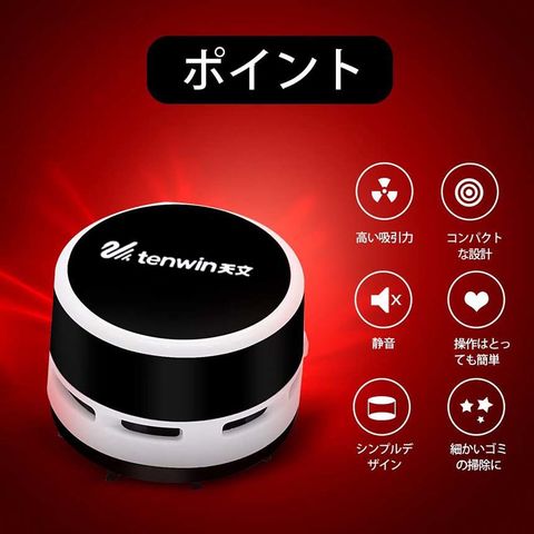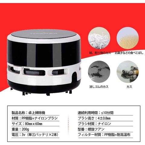 ▲「卓上パワフルクリーナー」500円硬貨を持ち上げるほどの吸引力(吸引口の中央に置き、水平に持ち上げた場合)。机の上の消しゴム削りかすや細かいゴミなどを手間なくきれいにする卓上掃除機スージーです。底面からゴミを吸い取り、排気は上部へ。ゴミを吹き飛ばすことなく、きれいに吸引できます。▲「高い実用性」コンパクトでパワフル吸引力があって、勉強と仕事時消しゴムのカス、削り物のカス、お菓子などの食べこぼし、机上のゴミやほこりやペットの毛など、事務用品としてはもちろん、玄関マット、キーボード、事務所のテーブル、家具の表面、車のクッション、座布団など掃除用具としても役立てられます。