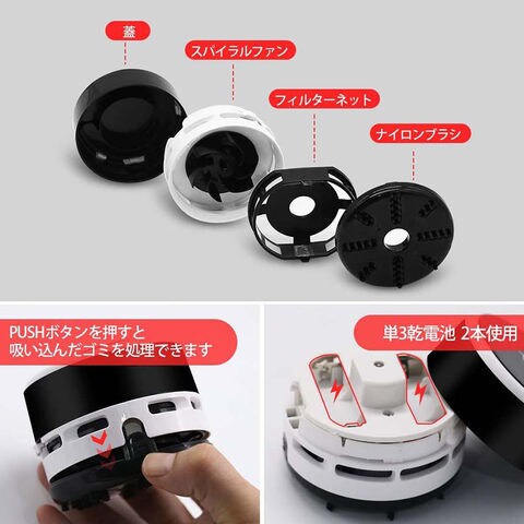 ▲「操作簡単」電池をセットしてスイッチをONにするだけで起動します。PUSHを押して底蓋を外してゴミを捨てます。とても便利です。