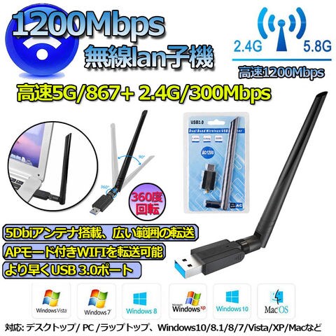 【2個セット】WiFi 無線LAN子機 1200Mbps USB3.0 2.4G(300Mbps)5G (867Mbps) WiFi アダプター 無線 5dBi IEEE802.11ac/n/a/g/b 技術 子機&親機 APモード デュアルバンド 高速伝送 操作簡単 放熱穴デザイン