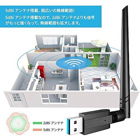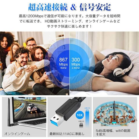 【高速無線通信】このWi-Fi 無線LAN 子機は5G(867Mbps)+2.4GHz(433Mbps)のデュアルバンドなので、前の規格と比べ、三倍も速いファイルを転送できます。大容量データを短時間でに転送でき、 HD動画ストリーミング、オンラインゲームなどサクサク快適に楽しめます!【より安定技術】最新先進のチップが最も安定ので、遅延が少なく、待ち時間が少ないです。電波障害を防ぐ高速アンテナを内蔵し、同一Wi-Fi環境において遅延を抑え、端末の混雑を低減できます。Wi-Fiを広範囲で高速に保ちます。ビデオストリーミング、オンラインゲーム、インターネットコールに最適で、スムーズなHDストリーミングと迅速なダウンロードを実現します。