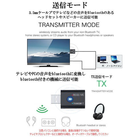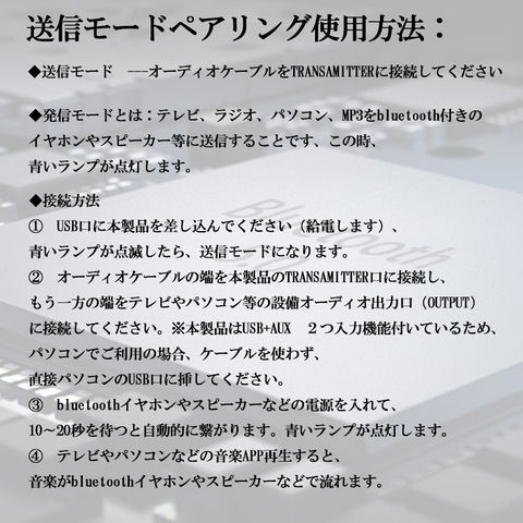 ◆発信モードとは:テレビ、ラジオ、パソコン、MP3をbluetooth付きのイヤホンやスピーカー等に送信することです、この時、青いランプが点灯します。