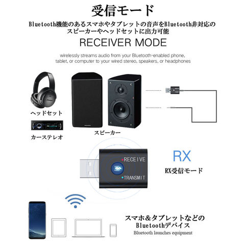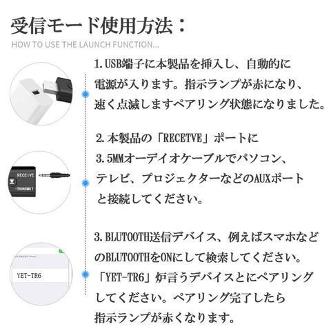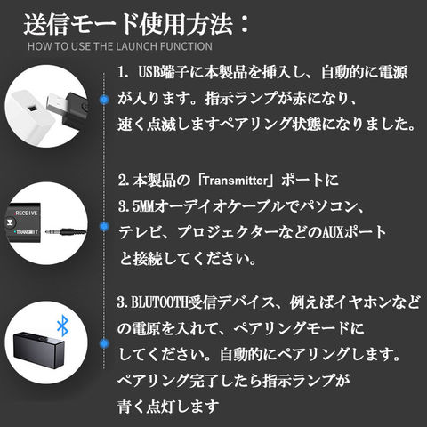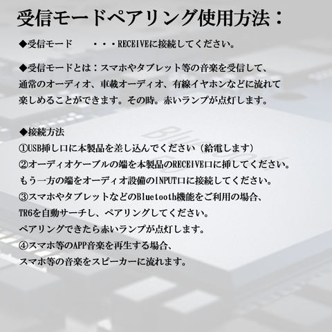 ◆受信モードとは:スマホやタブレット等の音楽を受信して、通常のオーディオ、車載オーディオ、有線イヤホンなどに流れて楽しめることができます。その時。赤いランプが点灯します。