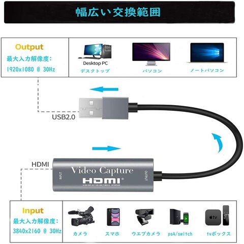 【1080P 30fps】HD解像度ビデオ録画とストリーミングの高品質体験を保証するために、USB 2.0インターフェイスを採用し、1080p/30fpsの高品質で録画できます。最大入力解像度:3840x2160 @ 30Hz、最大出力/録画解像度:1920x1080 @ 30Hz。