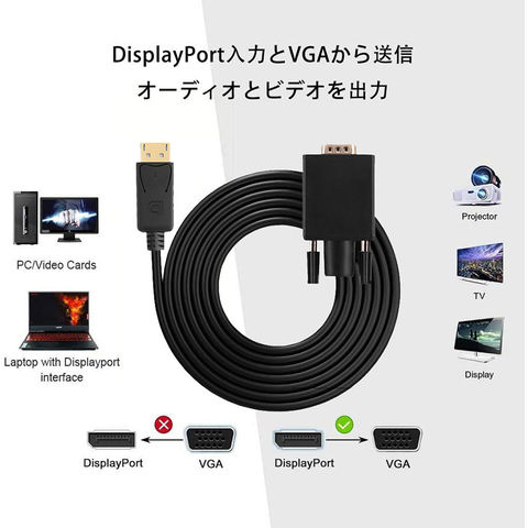 【DP to VGA 変換ケーブル】本製品はDisplayPort出力を、VGA入力に接続するための変換ケーブルです。逆方向のVGAポートからDisplayPortへは変換不可です。D-sub入力しかないディスプレイ+ディスプレイポート出力しかないPCに最適です。即ち、Displayportを搭載した機器から、VGA端子搭載の液晶ディスプレイやプロジェクターへの接続が可能になります。DPオス側にラッチ付きですので、安定&安心な接続を提供いたします。ビデオストリーミング、ゲーム、または作業環境を拡張するのに最適です。【高品質材料採用】金メッキ接点、錫メッキ銅導体、フォイル&編組みシールドの組み合わせで、高性能&信頼性の高い接続性を提供できます。また、EMIの影響を受けにくいクロックアーキテクチャが組み込まれています。