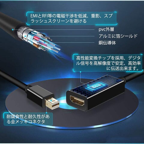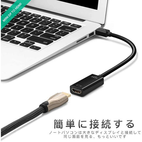 【ミニディスプレイ- HDMI変換】Mini DisplayPort搭載機器のデジタル映像を、HDMIコネクタを持つテレビやディスプレイ、プロジェクターなどに出力できる変換アダプタです。Mini Displayport 1.2a入力とHDMI1.4b出力に対応できます。複雑な設定などは不要、挿すだけで映ります。(※逆方向変換は非対応)【高性能&小型デザイン】金メッキコネクタと先進的なチップを採用しており、メインボードと回路の設計を改善することによって、より安定した映像に変換できます。そして、長さは20cmあり、柔軟性・耐久性ともに優れています。どこへでも持ち運べます。(ご注意)このアダプターを使うには、HDMIケーブルが必要です。