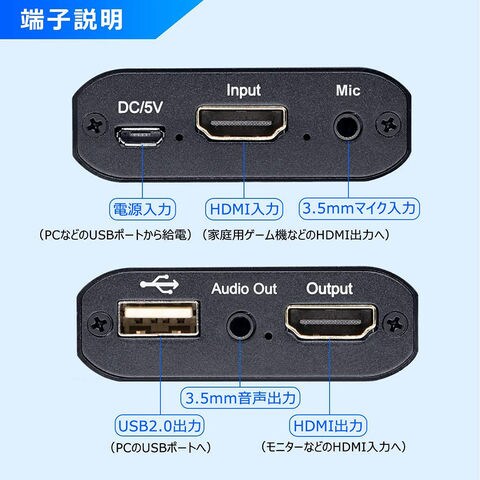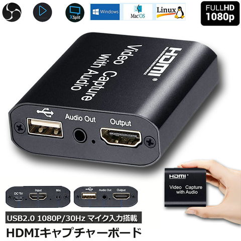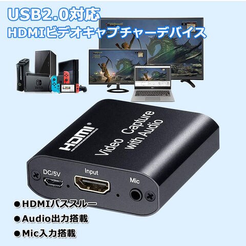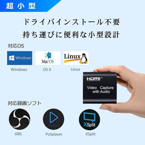 【その他の特徴】・Windows、Mac、AndroidのOSに対応。・VLC media player、OBS Studio、XSplitなどのライブ映像録画アプリケーションが使用できます。・ドライバインストール不要、持ち運びに便利な小型設計。「セット内容」本体×1、USB2.0ケーブル×1、USB給電ケーブル×1、マニュアル(英語)×1