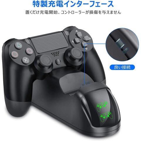 【安定性】PS4 コントローラー 充電器はPS4コントローラーがしかっりと嵌り、定感抜群の横置きスタンドとして収納できます。さらに底面に滑り止めのゴムを配置して、安定性を確保しています。【過充電防止】充電スタンドは過充電を防止する装置が搭載しており、PS4コントローラーが満充電してから、電源を自動的に切ります。
