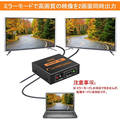ソース機器のHDMI信号をミラーモードで映像を同時に2つのディスプレイに出力します。
