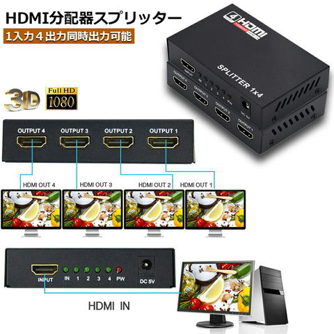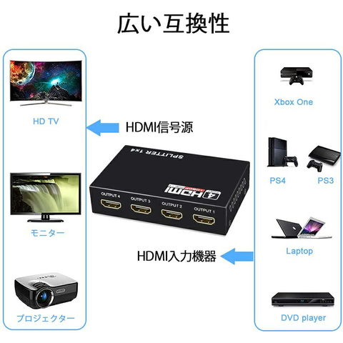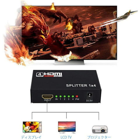 一台のHDMI出力端子付きプレーヤー(ブルーレイ、DVD、PC、PS3、PS4など)の映像と音声信号を、4台のHDMI搭載液晶テレビやモニタに出力可能な分配器です。