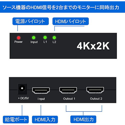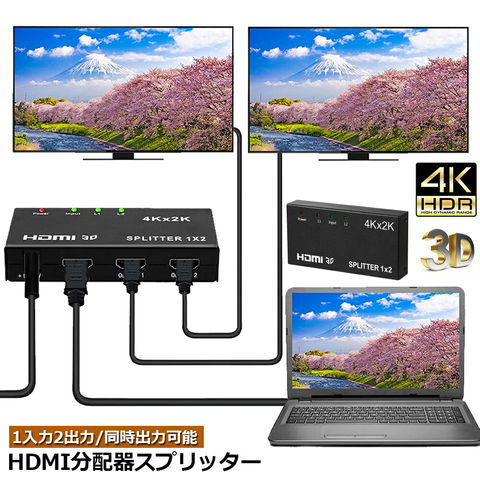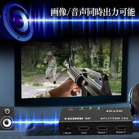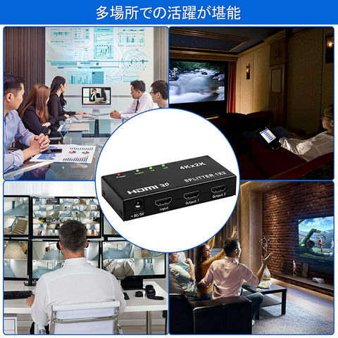 HDMI 分配器 2出力:ゲーム機やBDレコーダー等のソース機器からHDMI信号(映像&音声)を、2台までのディスプレイ機器(テレビやプロジェクター等)に同時出力できるHDMI分配機(HDMIスプリッタ)です。4K*2Kまでの解像度に対応:4K(3840*2160@30Hz /10.2Gbps)、3D映像やHDCP1.4に対応しており、美しく高精細な4K映像を劣化なく写り出します。展示会や会議など、多くのモニターに同時出力させる場合に適します。ご注意Chromecast、Apple TV、PS4proに未対応です)