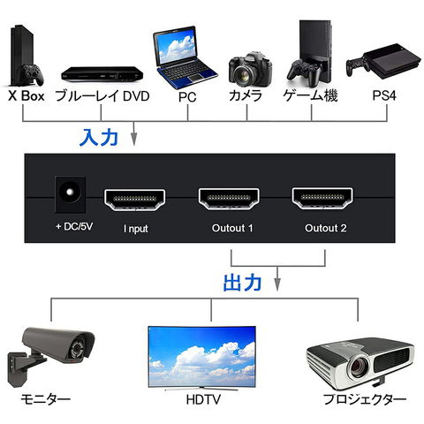 HDMI出力端子付きプレーヤー(PC、TV BOX、Blue Ray DVDプレイヤー、PS3、PS4、Xbox360)の映像と音声信号を、2台のHDMI搭載液晶テレビ/モニタ/ディスプレイに出力可能な分配器です.最大3.4Gbps/340MHzの帯域に対応し会議室、教育現場、展示会、ご家庭のリビングなど、いろいろなところでご使用いただけます.