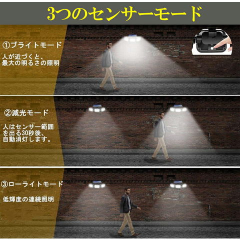 1.【センサーモード】夜や暗くなるんと、普通は点灯しません。人や動物の動きを感知すると、自動的に自動的に高輝度点灯になって、動きがなくなると約30秒後消灯になります。
