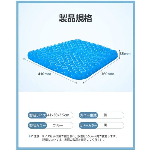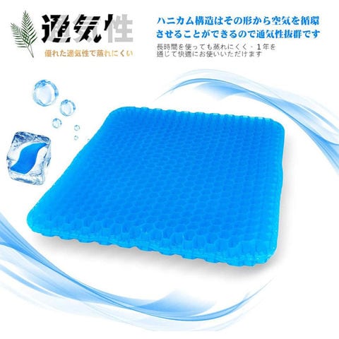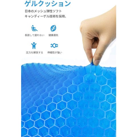 【二重ハニカム構造のクッション】サイズ:約41*36*4 CM 低弾性のゲル状の材料と二重のセルラー構造を採用して設計し、通気が快適で、凹凸の通気孔は臀部の圧力を分散させ、臀部と太もも部の空気の流通を加速させ、両面で使用できる。シートクッションは最大限のサポートと快適さを提供し、よりソフトな圧力を軽減します。ゲル状材料の減圧格子配列は、体重を効果的シートクッションに分散させ、下半身の負荷を減少させる。【通気性抜群】ブルーくっしょんは通気設計で、表と裏の両方に通気口があり、圧力を解放し、柔軟性があり、快適さもさらに向上します。高弾性TPEゲルの恒温材料を採用し、高弾性を持ち、座り心地がより快適である。適度な硬度は均質に吸収し、体圧を分散させ、久座族の人々の悩みを緩和します。夏でも冬でも、お尻は適度な温度を保ちますので、このジェルクッションで四季に対応できます。